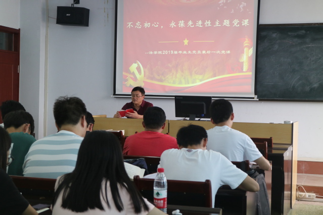 为引导毕业生党员充分发挥党员的先锋模范作用,在今后的学习工作中能够不忘初心,牢记使命,6月5日下午,法学院在西校区2号教学楼323室为2019届毕业生上最后一次党课。党课由法学院党总支书记张宗磊主讲、法学院学生工作办公室主任许燕飞主持,2019届全体毕业生党员参加了此次活动。