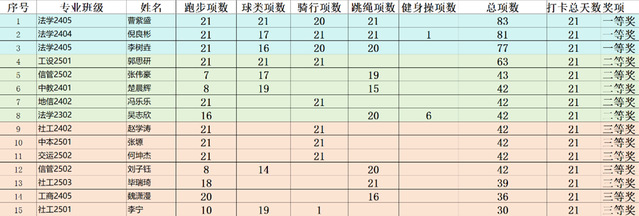 11月12日,为期21天的“青春运动日记”打卡挑战赛圆满结束。本活动由校团委主办、校学生会与法学院文体部联合承办,自活动开展以来,全校各学院学生积极参与,在为期21天的打卡活动中,学生们以汗水记录青春,凭坚持见证成长。