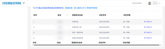②证书范围:主要用于科技活动单项奖、社会工作单项奖、文体活动单项奖、学习成绩单项奖、学校一等奖学金、学校二等奖学金、学校三等奖学金、优秀学生、优秀学生干部等各类校级荣誉证书的打印。