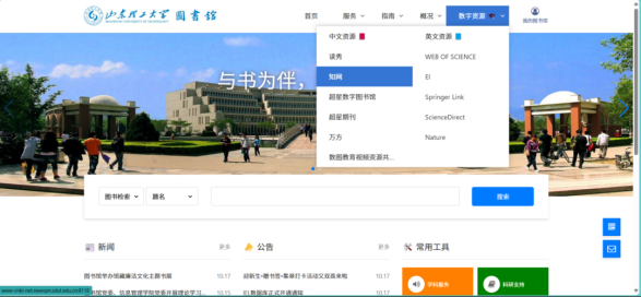 (5)找到知网。找到右上角的“数字资源”,下拉选项找到“知网”点进之后即可登录学校购买的知网资源。