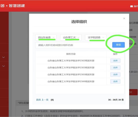 依次选择“团山东省委-山东理工大学团委-法学院团委”-“输入组织名称—山东省山东理工大学法学院法学/社会工作250*班团支部”或在下方直接找寻对应班级也可。