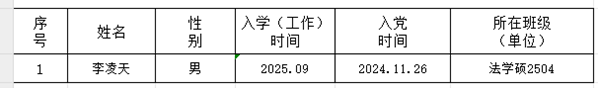 经党组织的培养教育,李凌天于11月26日预备期满,党支部拟在近期召开党员大会讨论他们的转正问题。为了进一步增强发展党员工作的透明度,严格发展党员工作程序,根据《中国共产党发展党员工作细则》文件的有关精神,现进行公示,公示期5天,自2025年11月27日至2025年12月1日。对李凌天的转正问题,如有异议,请当面或通过书信、电话、电子邮件等方式反映,我们将为您严格保密。
