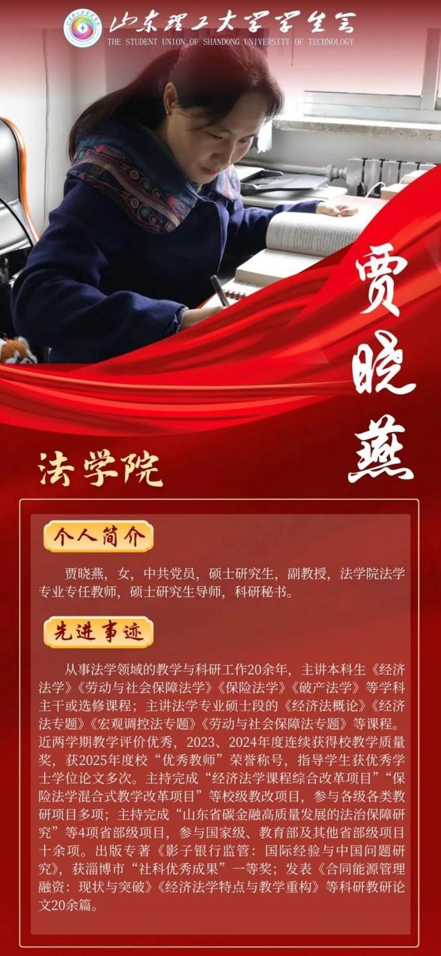 贾晓燕老师深耕教学一线,始终以学生为中心,将专业知识与实践案例巧妙融合,课堂生动鲜活、干货满满;在课后,她耐心答疑解惑、悉心指导成长,用温暖与责任搭建起师生沟通的桥梁,成为学生求学路上的良师益友。此次获奖,是对贾老师多年来教学工作的高度认可,更是广大学生对她三尺讲台上无私奉献的真挚回馈。