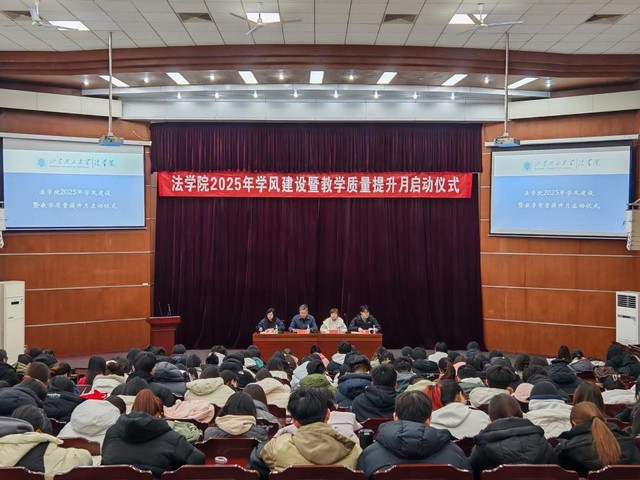 12月11日下午,法学院在模拟法庭举行2025年学风建设暨教学质量提升月启动仪式。法学院党委副书记宋立平、教学科研工作办公室主任陈瑛、辅导员韩帅和学院各班级主要学生干部参加。学工办主任苗涛主持活动。