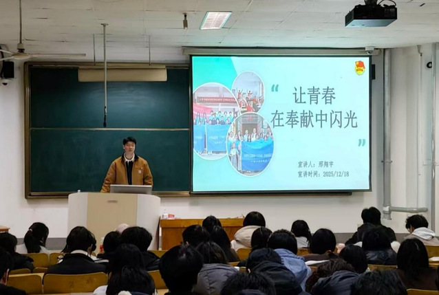 宣讲中,邢翔宇以“让青春在奉献中闪光”为主题,从“奉献与成长的双向奔赴”“青春绽放的舞台”“生命影响生命的旅程”“迈出实践的第一步”四个维度展开讲解。